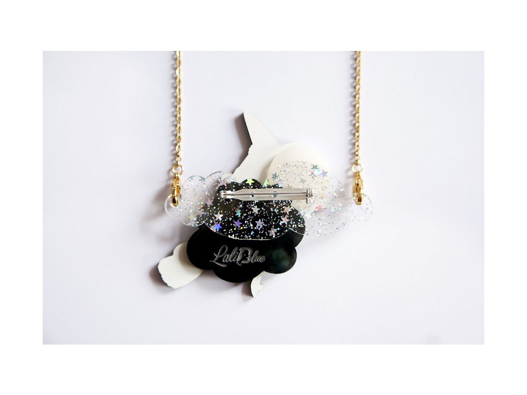 Tento kousek z dílny LaliBlue je unikátní nejen detailním zpracováním, ale také variabilitou. Můžete ho nosit jako brož nebo připnout řetízek a upravit ho na náhrdelník. Záleží jen na Vás. Rozměry jsou 7,5 x 6 cm, délka řetízku včetně karabinek je 40 cm. Vyrobeno z ilustrovaného dřeva s povrchovou úpravou z lesklé akrylátové pryskyřice, měsíc svítí ve tmě, je z akrylu, stejně jako mraky, které jsou navíc zdobeny třpytkami. Zapínání z nerezové oceli.