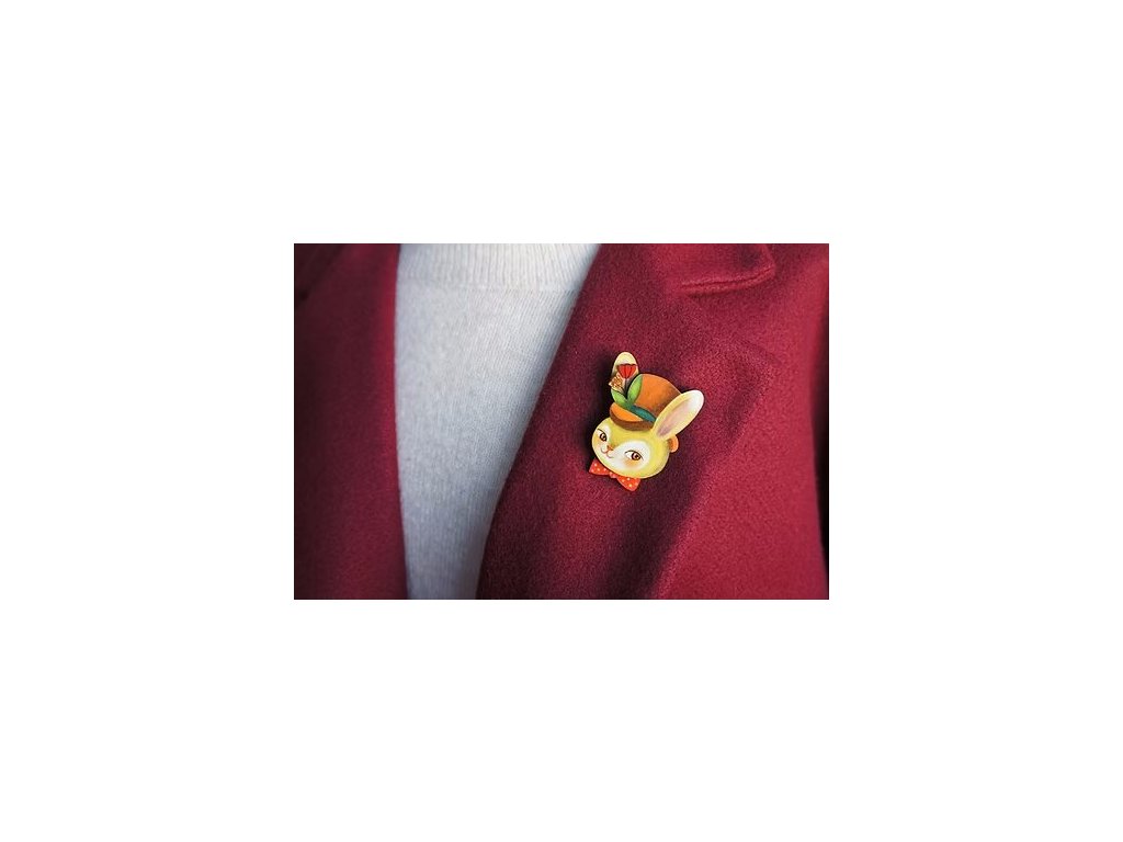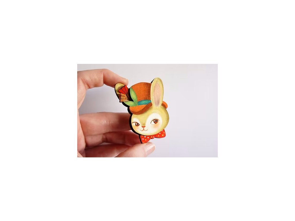 Rozměry brože 5 x 4 cm se zapínáním na sponu s pojistkou. Je vyrobena sublimační technikou ze dřeva a akrylové pryskyřice se třpytkami. Květinky na klobouku jsou plastické, vyrobeny z akrylové pryskyřice Zapínání z nerezové oceli.
