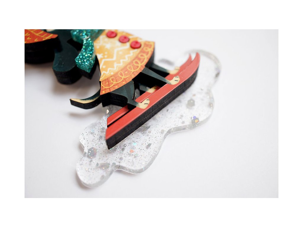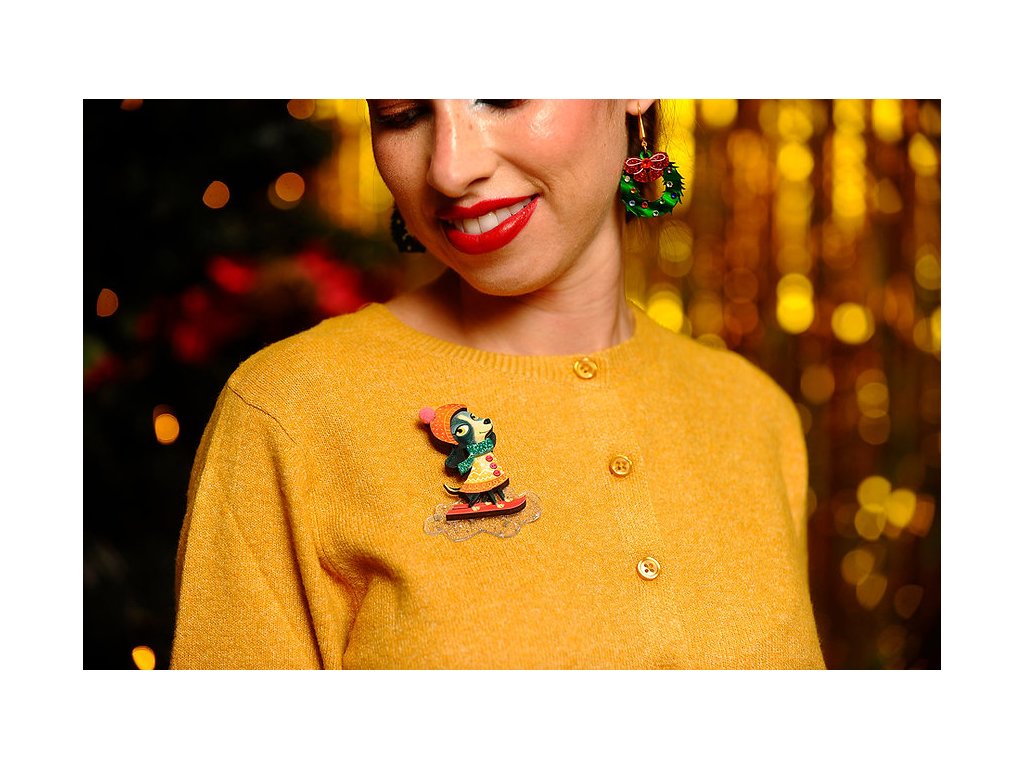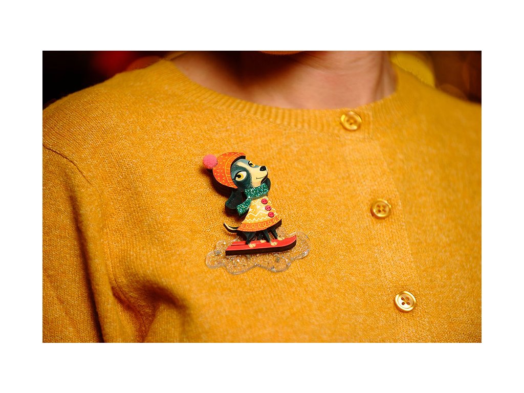 Brož je vyrobena ze dřeva s metakrylátovými detaily, měkkou bambulí na čepici a ozdobnými knoflíčky.