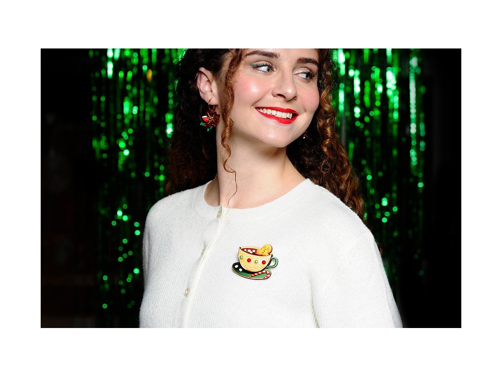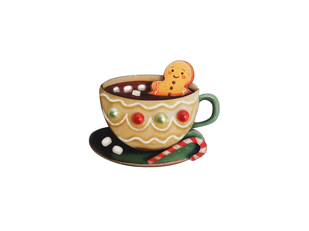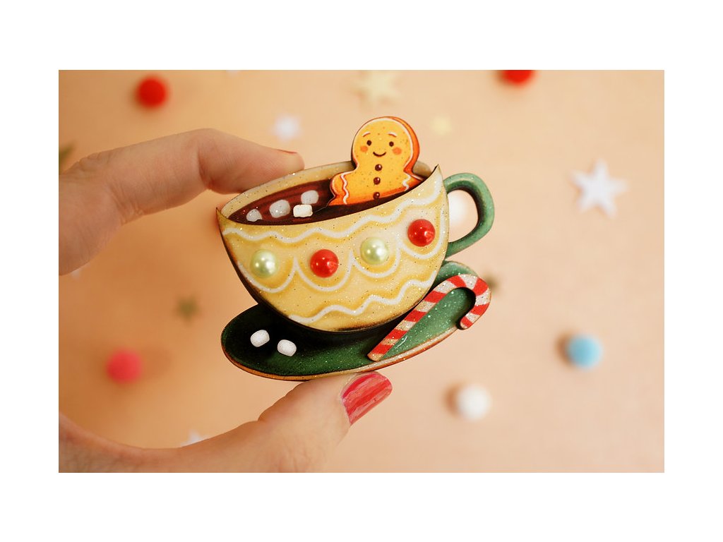 Nalaďte se slavnostně s naší vánoční broží, rozměry 6,5 x 4,5 cm, se zapínáním na sponu s pojistkou. Vyrobena sublimační technikou ze dřeva a akrylové pryskyřice se třpytkami. Hrneček je důmyslně vyroben ze dvou částí tak, že perníkový panáček se v hrnku skutečně koupe, ponořený v čokoládě. Marshmallow i lízátková hůlka také budí dojem prostoru, navíc je hrneček zdoben korálky s perleťovým povrchem. Zapínání z nerezové oceli.