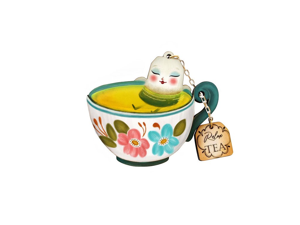Rozměry brože jsou 6 x 5,5cm se zapínáním na sponu s pojistkou. Vyrobena sublimační technikou z prořezávaného dřeva a poloprůsvitné akrylové pryskyřice z zářivě limetkové barvy. Zapínání z nerezové oceli. Krásným detailem je řetízek se zavěšenou etiketkou s nápisem Relax Tea protažený uchem šálku.