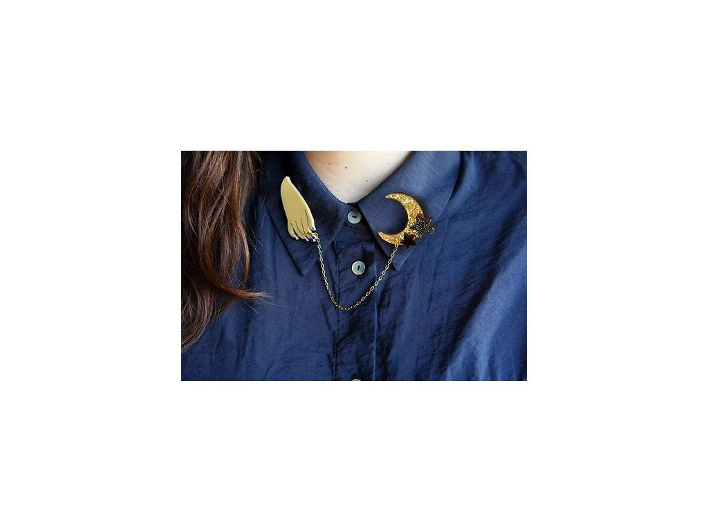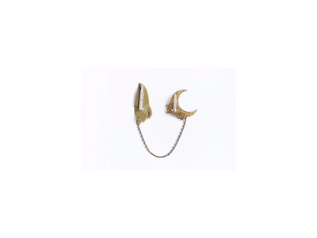 Dvoj brož je vyrobena z akrylové pryskyřice se třpytkami, Velikost ruky je 5,5 x 2 cm, velikost měsíce je 4 x 3,5 cm. Ruka je s měsícem spojena zlatým řetízkem, obě části jsou vybaveny zapínáním s bezpečnostní pojistkou.