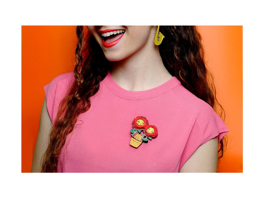 Brož o rozměrech 9 x 6 cm je vyrobena ze dřeva submlimační technikou a doplněna akrylem se třpytkami a zrcadlovým efektem. Pkvětní lístky jsou vrstveny tak, aby šperku dodaly hloubku. Květináč je vyrobený z oranžového akrylu připomínající barvu terakotové hlíny a doplněného třpytkami. Zapínání na sponu s pojistkou vyrobené z nerezové oceli.