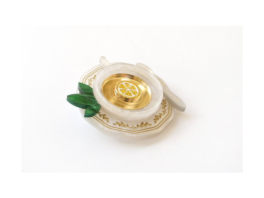 Brož má rozměry 5 x 5cm a je zdobena zlatými, ručně malovanými, gravírovanými detaily. Má krásný, perleťový resin v kombinaci se zlatou barvou čaje, zelenými lístky a žlutavým plátkem citronu. Zapínání na sponu z nerezové oceli s pojistkou. Vyrobena z akrylové pryskyřice.