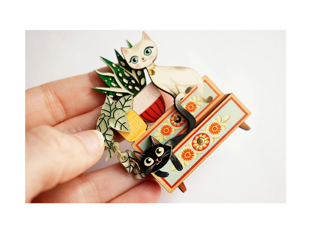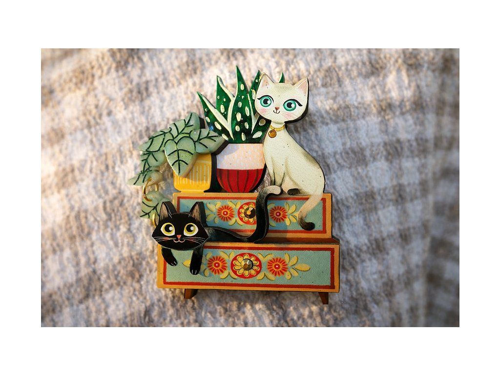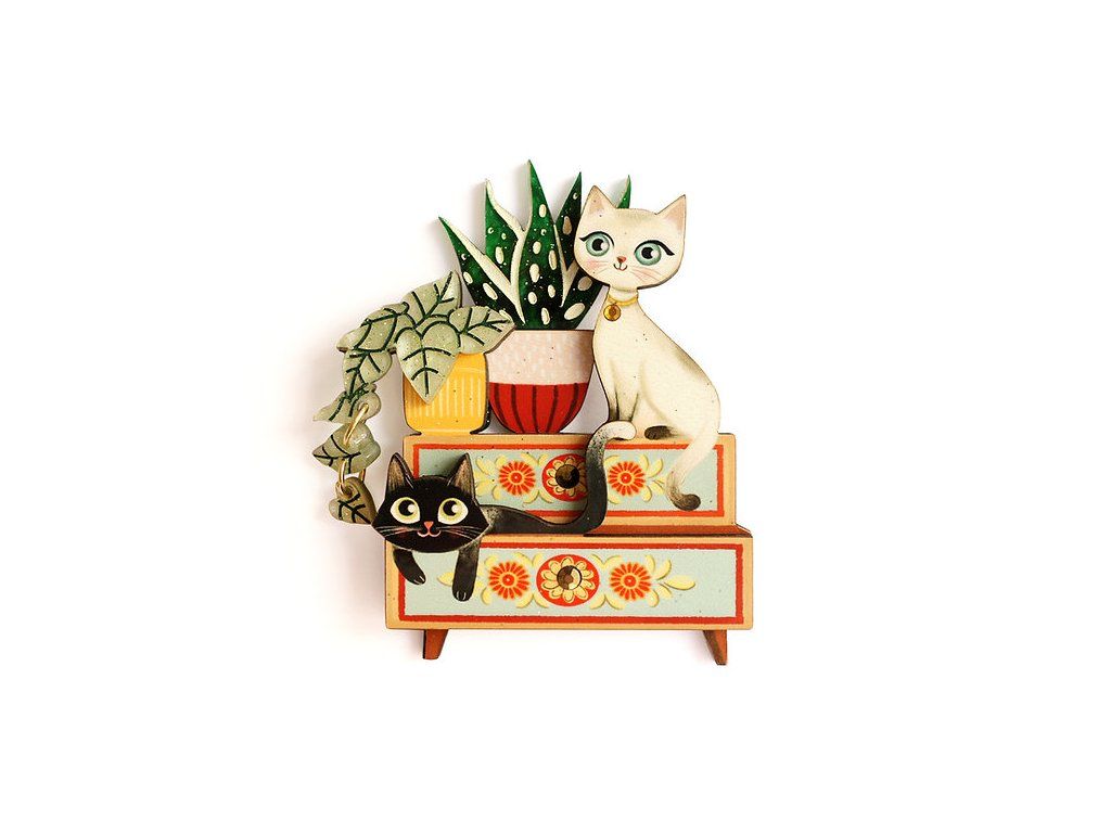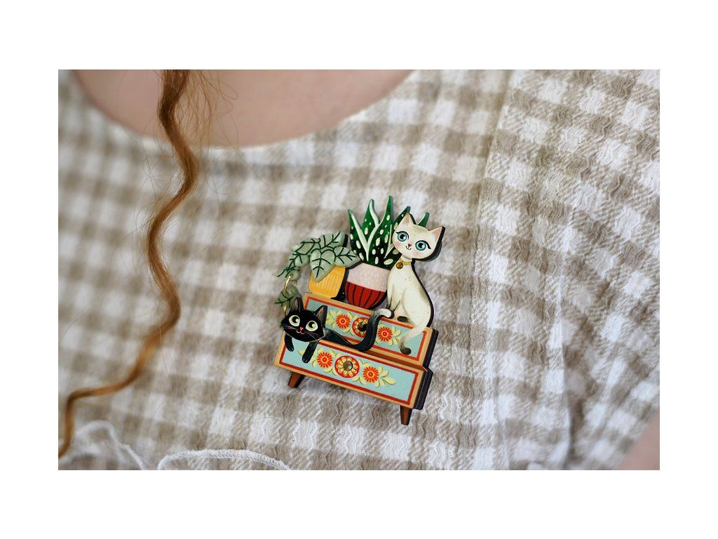 Ilustrovaná brož s dvěma zvědavými koťátky mezi rostlinami na malované vintage skříňce s motivy květin. Brož je vyrobena ze dřeva a akrylu, jehož vrstvy dodávají motivu objem a hloubku.