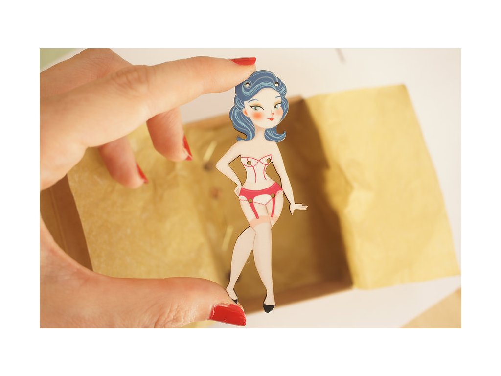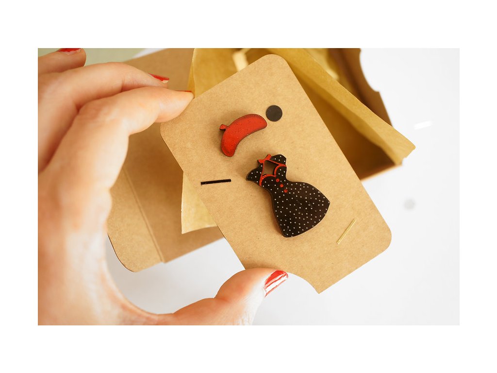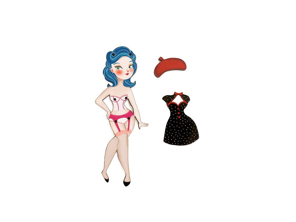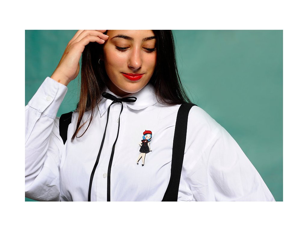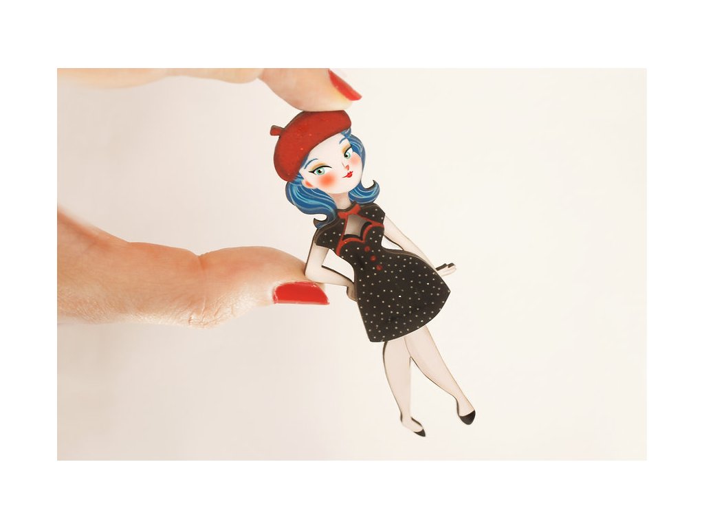 Brož je naprosto speciální, protože k Lali bude přiložen jeden její základní outfit a tím jsou černé, klasické šaty a červený baret. Toto oblečení připevníte k broži panenky pomocí otvorů, kterými provléknete malé zápinky. Oblečení lze tedy libovolně obměňovat a věřte, že Lali má oblečení pro každou příležitost, pro všední den i pro dny sváteční. Kterýkoliv z jejích outfitů je samozřejmě možné objednat a najdete je v sekci LaliBlue broží "Na objednávku".