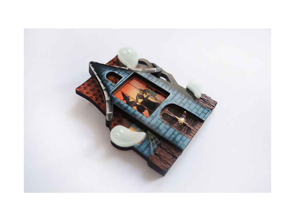 Brož má rozměry 7,5 x 6 cm, se zapínáním na sponu s pojistkou. Vyrobena sublimační technikou ze dřeva a akrylové pryskyřice, doplněná zlatou klikou na dveřích. Duchové jsou vyrobeni z fosforeskující pryskyřice, která ve tmě září. Zapínání z nerezové oceli.