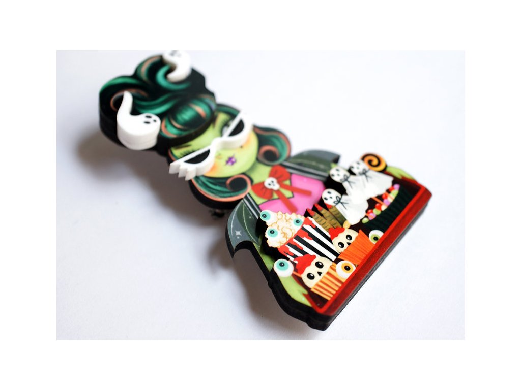 "Stráaaaašlivý popcorn ... děééésivé sladkosti ... neodolateně jedovaté dobroty!" Vyvolává na pouti tahle upíří slečinka se stylovými, slunečními brýlemi a nadýchaným Bouffant drdolem ve stylu 60. let, ve kterém se jí prohánějí duchové. Tak co si vyberete? Popcorn s krvavýma očima, gumové prsty, muffiny se zlověstným pohledem nebo lízátko s duchem?