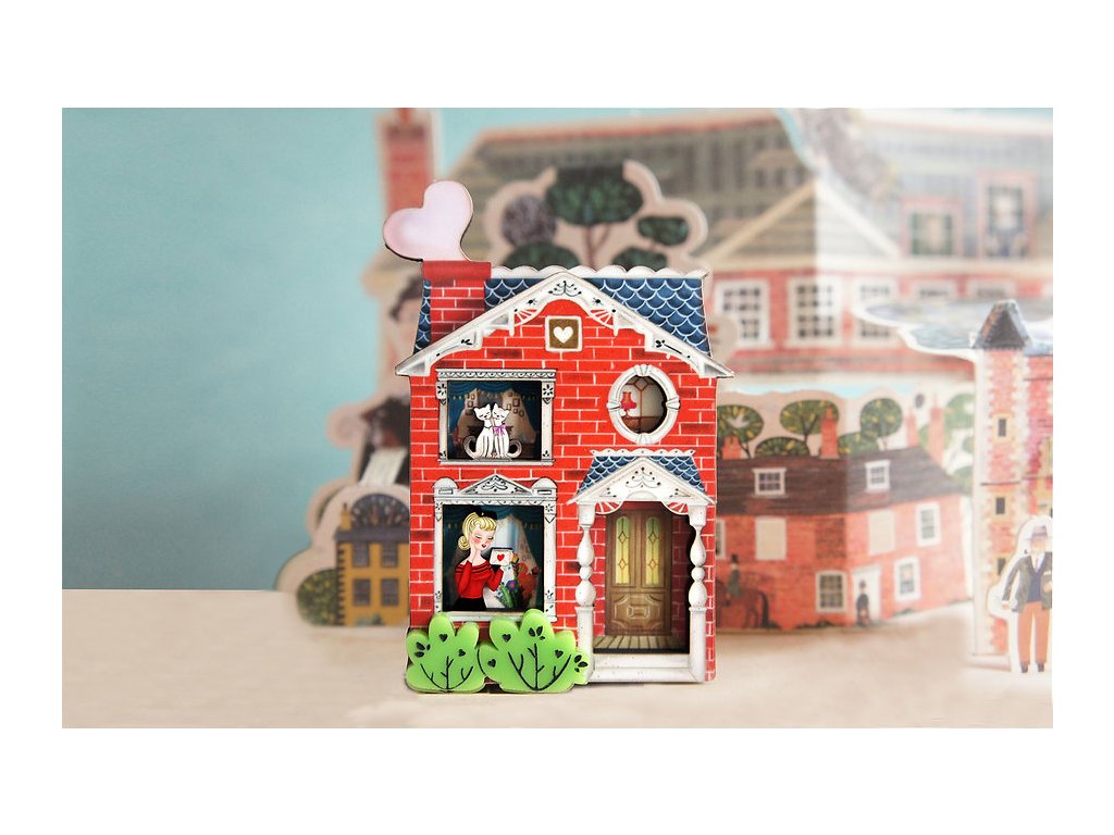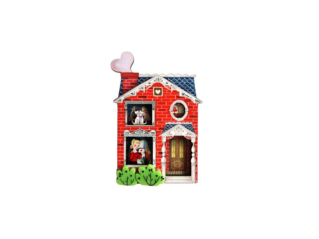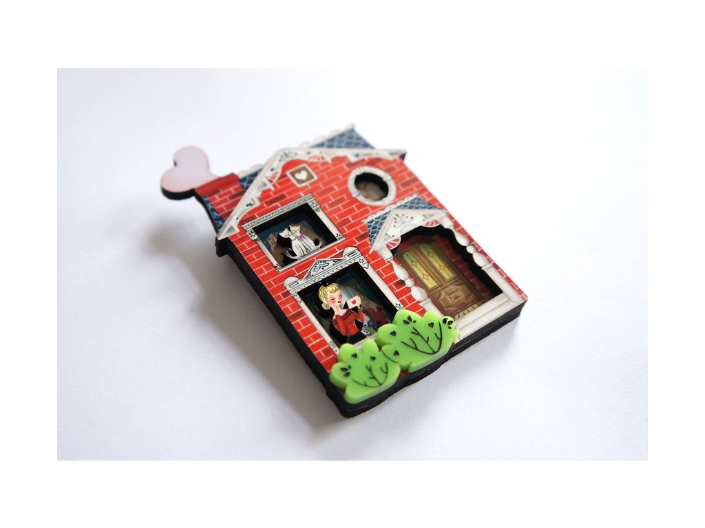 Krásně propracovaná brož s motivem domu pro všechny zamilované je ideálním šperkem pro oslavu dne sv. Valentýna. Má rozměry 8 x 6 cm a je vyrobena ze dřeva a lesklé, akrylové pryskyřice. Dřevo je vyřezávané tvoří tak poutavý detail zápraží s 3D efektem. Zapínání na sponu s pojistkou z nerezové oceli.