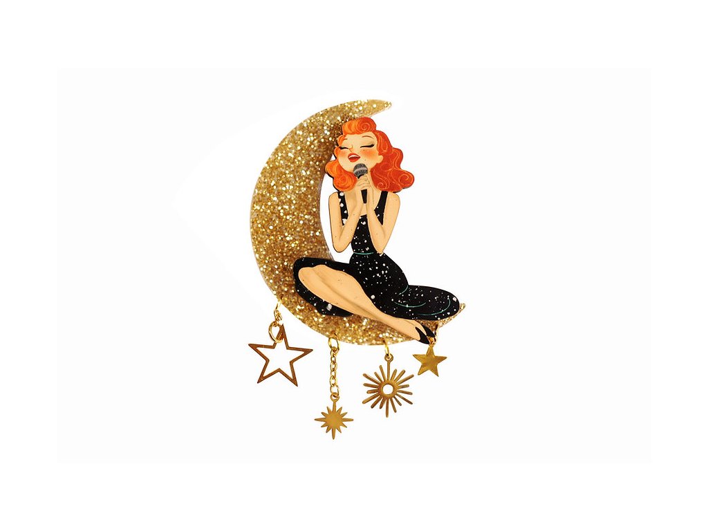 Rozměry brože 9 x 6 cm se zapínáním na sponu s pojistkou. Je vyrobena sublimační technikou ze dřeva, třpytivého měsíce z akrylové pryskyřice a přívěsků ve tvaru hvězd ze zlacené, nerezové oceli . Zapínání z nerezové oceli.