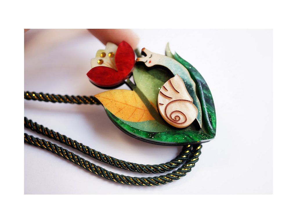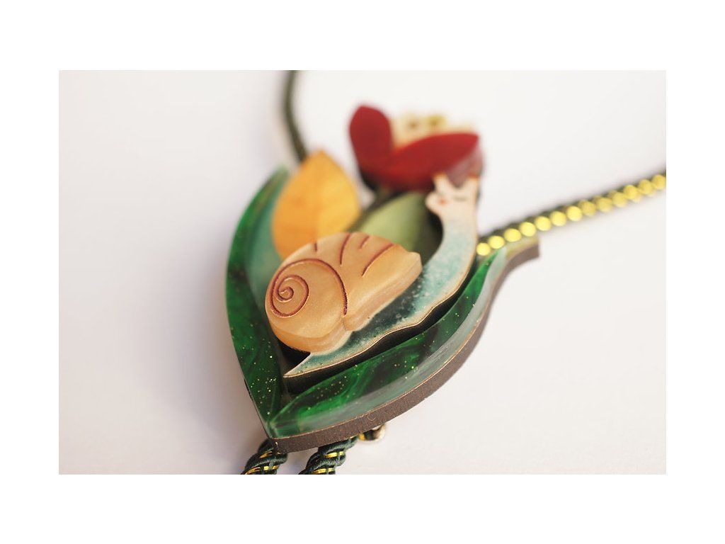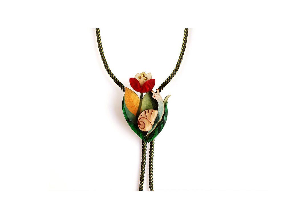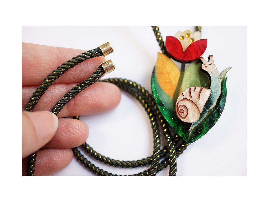 Náhrdelník ve stylu bolo s jemnou květinovou kompozicí a malým šnekem je plný šarmu a mnoha detailů. Originální a elegantní kousek, který dokonale doplní váš vzhled o jedinečný nádech. Vyrobeno ze dřeva, akrylu a třpytivých kamínků , kombinuje vrstvy, které dodávají motivu objem a jedinečný vzhled.
