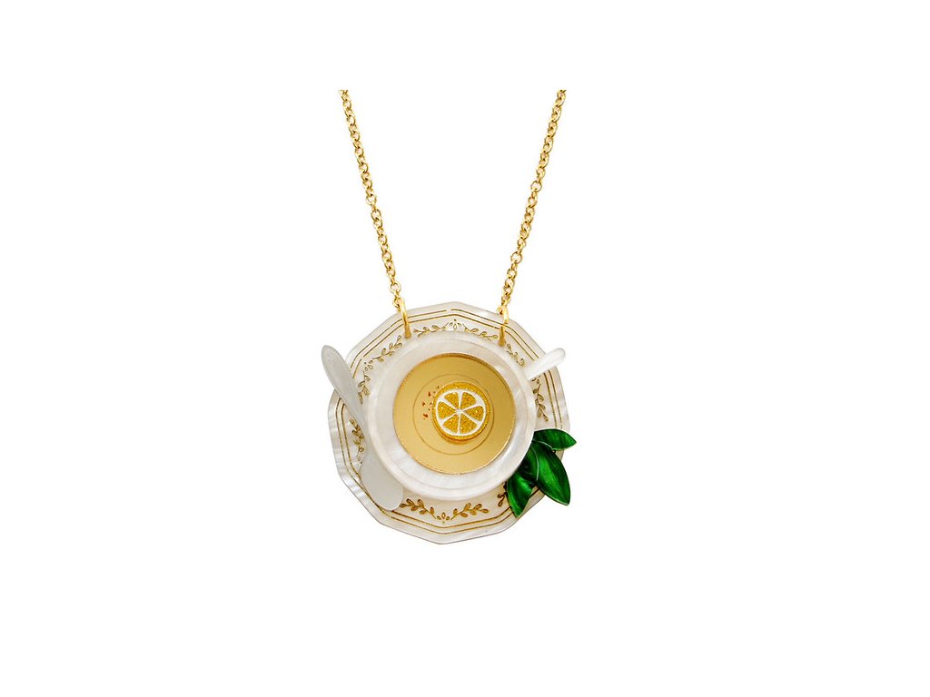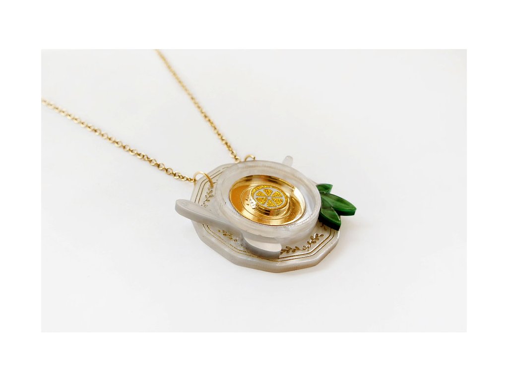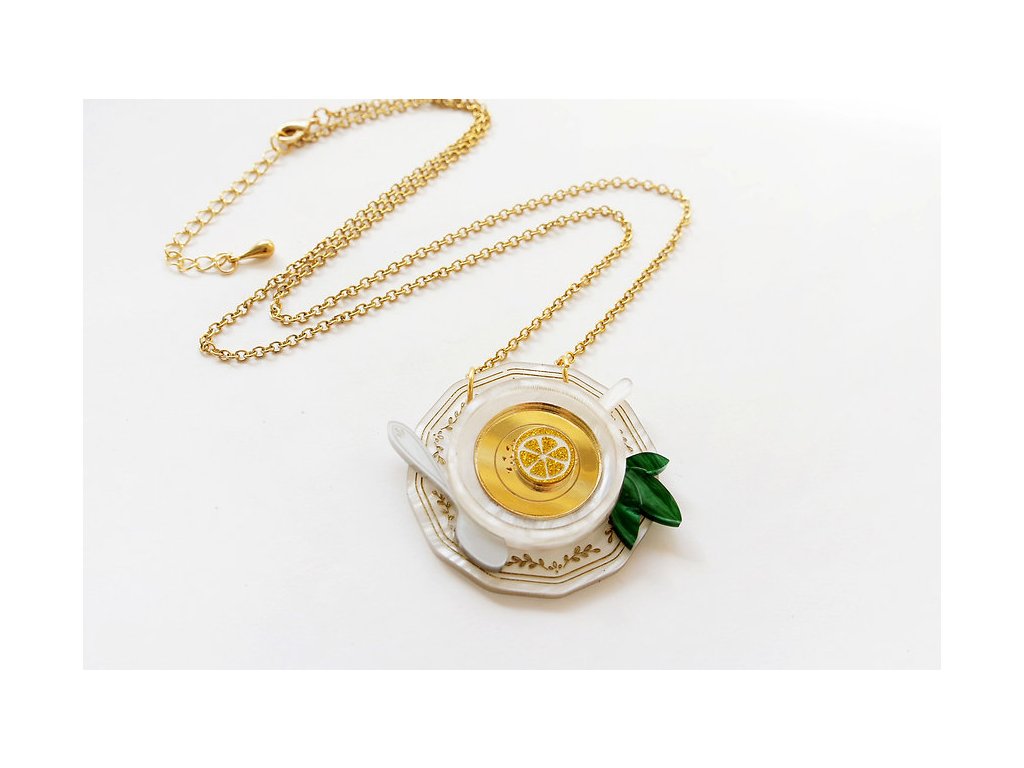 Náhrdelník má rozměry 5 x 5cm a je zdoben zlatými, ručně malovanými, gravírovanými detaily. Má krásný, perleťový resin v kombinaci se zlatou barvou čaje, zelenými lístky a žlutavým plátkem citronu. Přibližná délka řetízku je 60 cm s karabinovým zapínáním a prodloužením o 6 centimetrů. Vyrobeno z akrylové pryskyřice.
