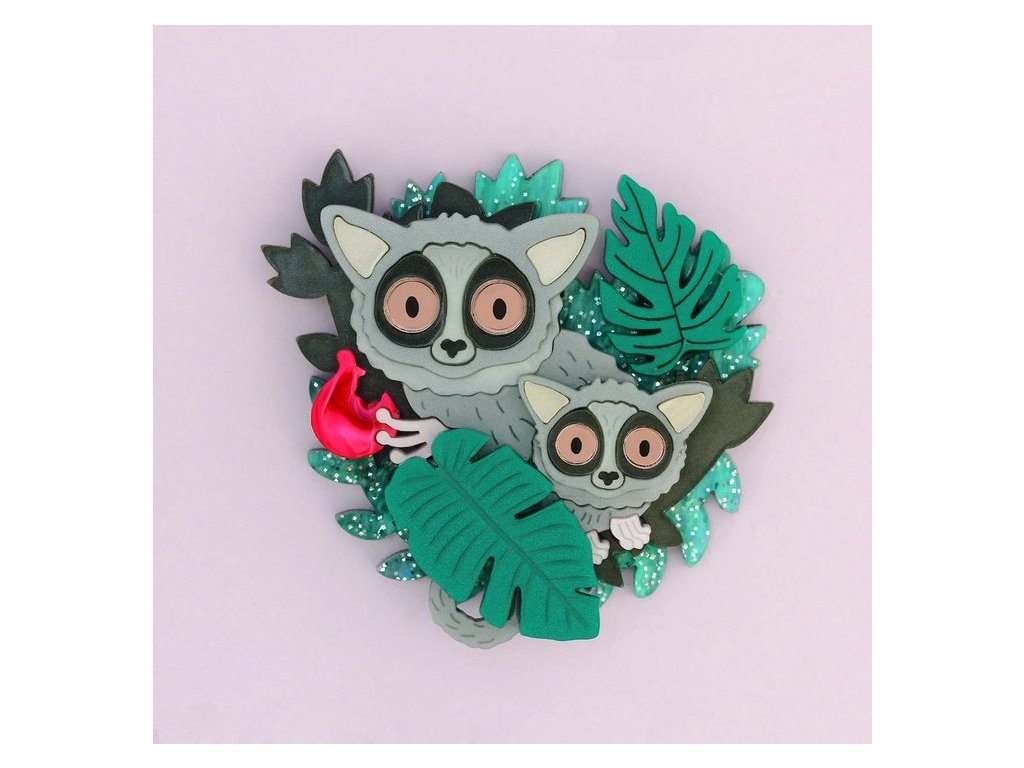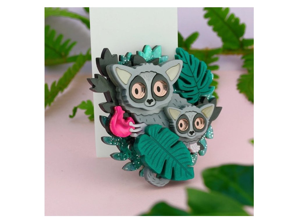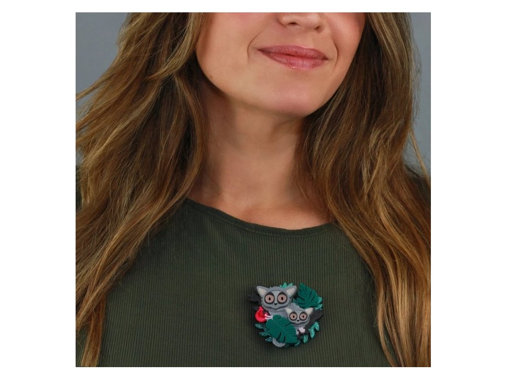 Krásná, výrazná brož Bushbaby byla s láskou sestavena z vrstev laserem řezaného akrylu s ručně malovanými detaily. Kombinace královské a třpytivé zelené, zrcadlové pryskyřice v barvě růžového zlata a platinově šedé vytvářejí luxusní šperk, který upoutá pozornost každého, kdo ho uvidí.
