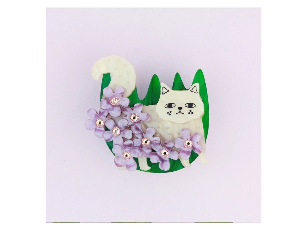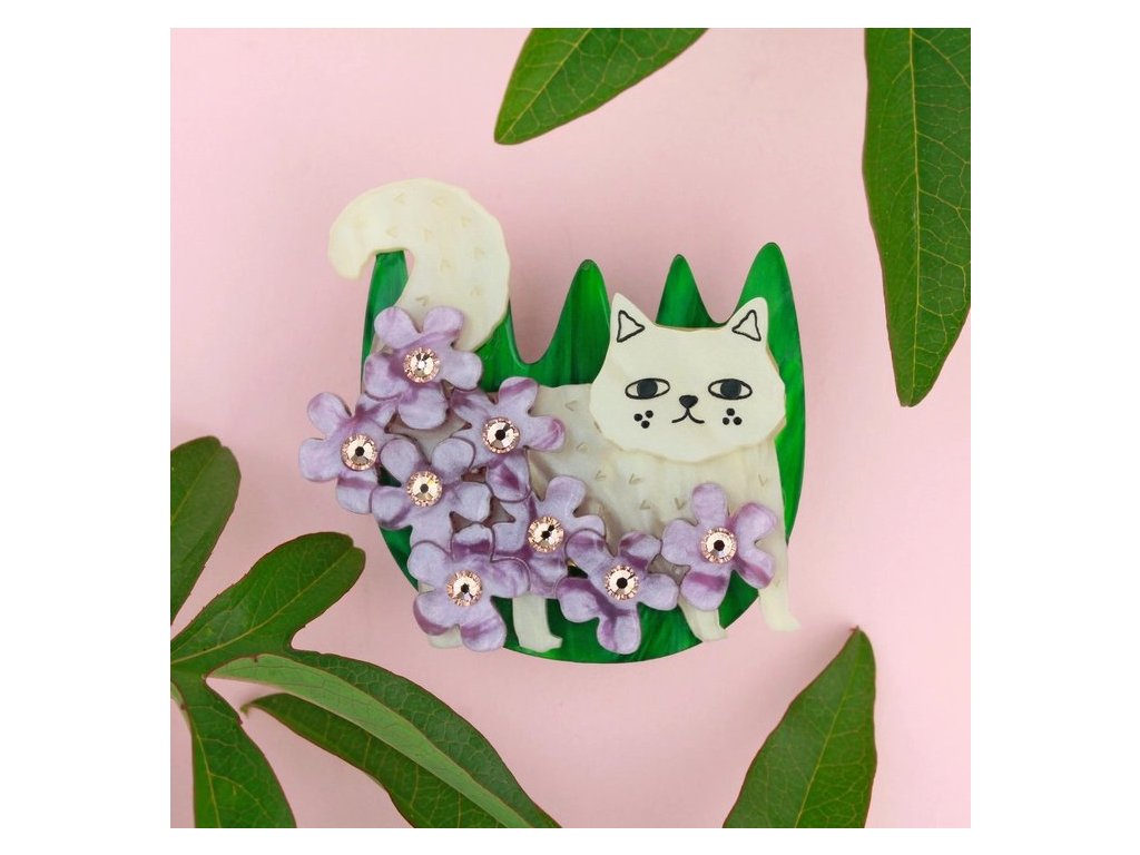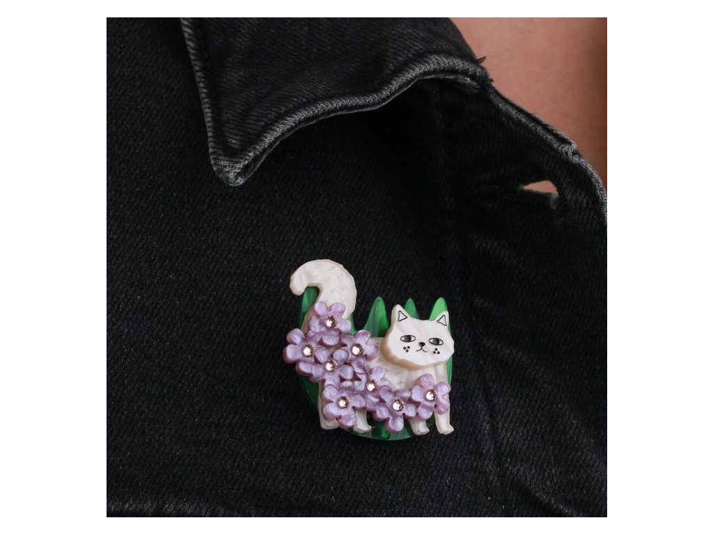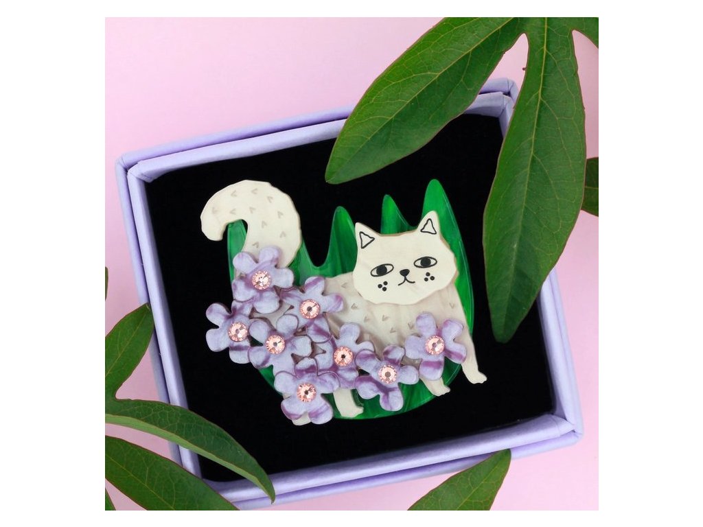 Tato brož je vyrobena z krásně mramorovaných prvků z akrylové pryskyřice, detaily jsou leptané a ručně malované. Každý kvítek šeříku je zdoben třpytivými krystaly. Brož je ručně vyráběna v malých sériích. Zapínání na brožový můstek s bezpečnostní pojistkou.