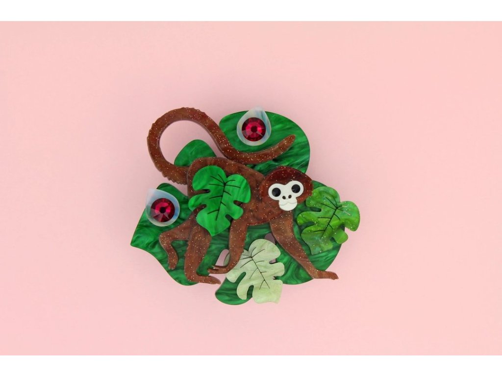 Brož Spider monkey, která evokuje obrazy bujných deštných pralesů, je úchvatným doplňkem každého Vašeho outfitu. Laserem vyřezávaná akrylová opička se prohrabává bujným, listnatým podrostem a hledá své oblíbené ovoce, fialové fíky. Brož je pečlivě, ručně sestavená a zdobená párem nádherných krystalů Swarovski.