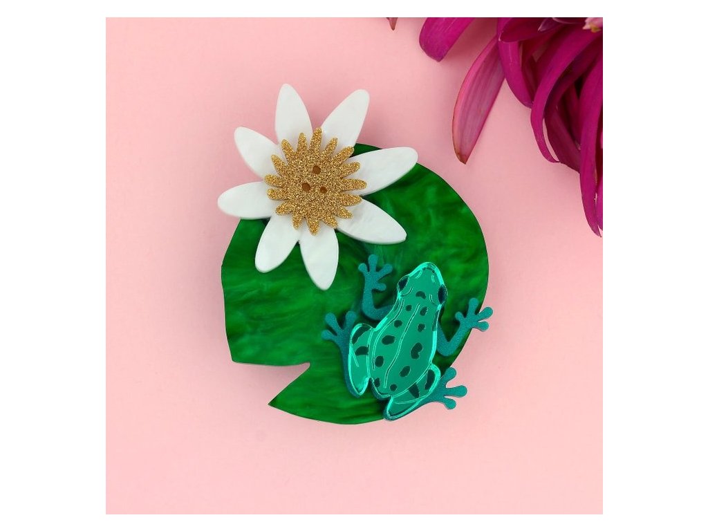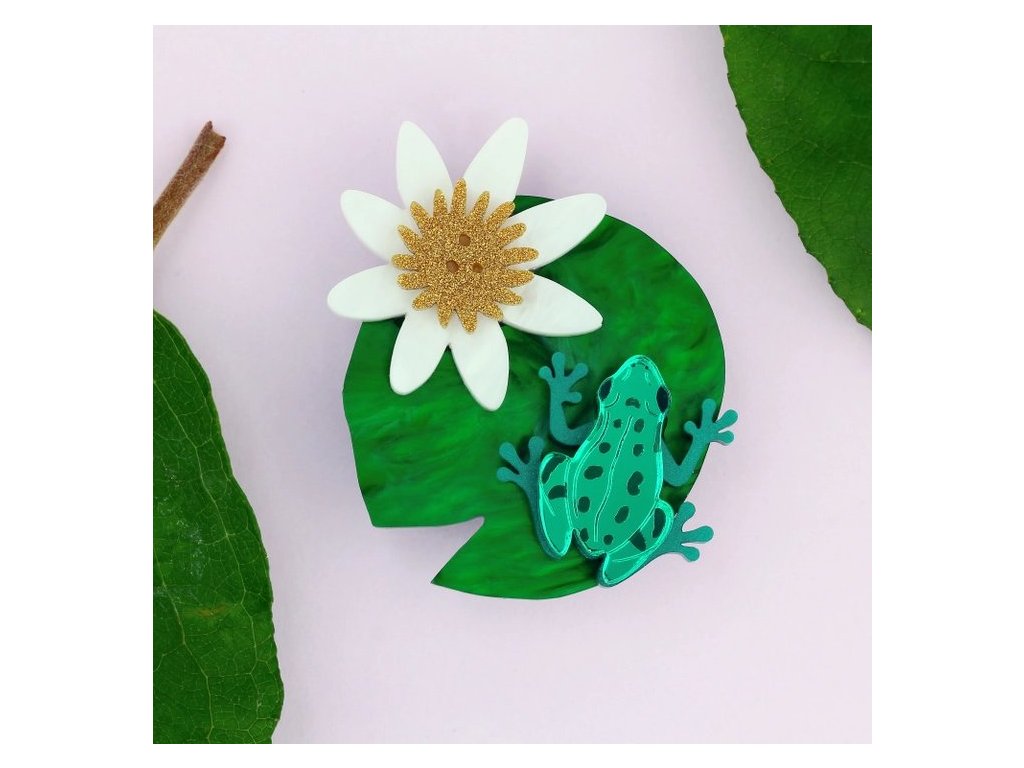 Krásná, výrazná brož leknínového listu s květem, na kterém sedí malá, zelená žabka byla s láskou sestavena z vrstev laserem řezaného akrylu s ručně malovanými detaily. Kombinace zelených, zrcadlových pryskyřic a bílé na květu vytvářejí luxusní šperk, který upoutá pozornost každého, kdo ho uvidí.