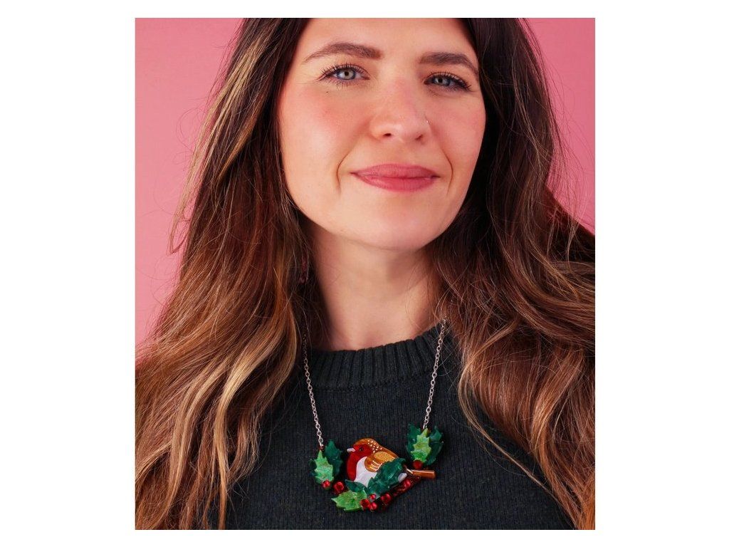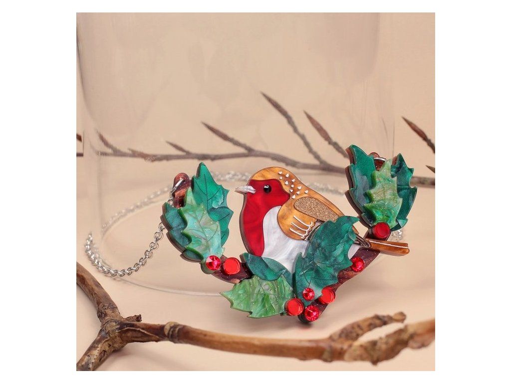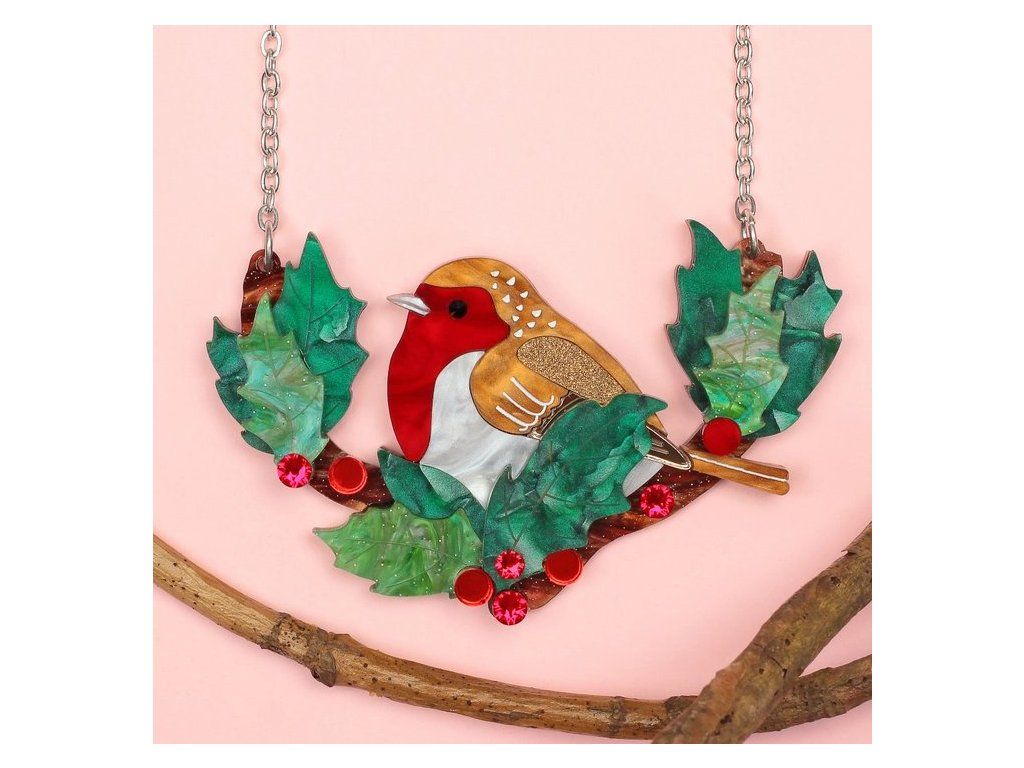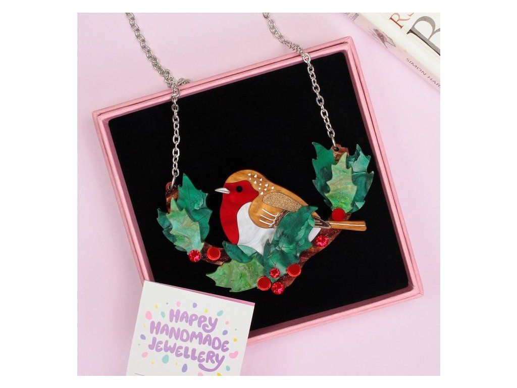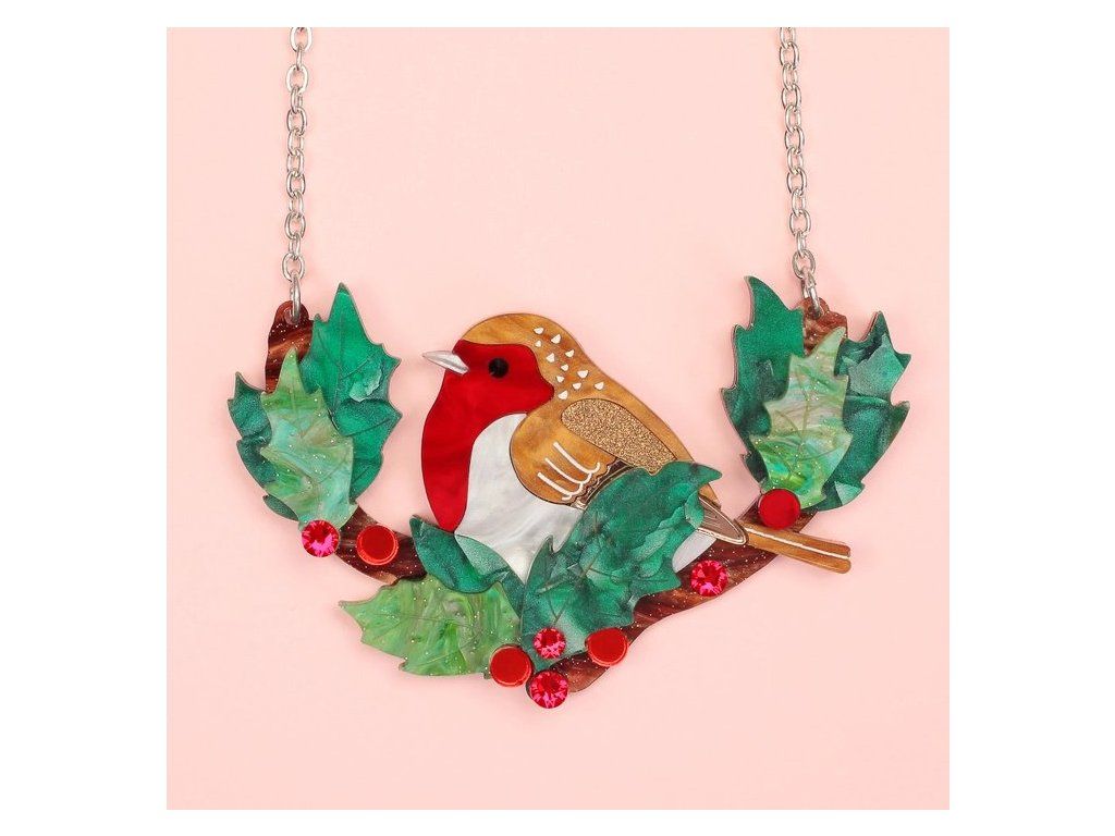 Náhrdelník s červenkou je ručně vyroben v ateliéru v Sussexu z luxusních akrylových materiálů s mramorovým vzorem, zrcadlovým povrchem a třpytkami. Nejvýraznějším prvkem je mramorově červená hruď ptáčka, který je zasazena mezi svěžími, zelenými listy cesmíny, s třpytivými červenými, křišťálovými bobulemi rozesetými po větvi.