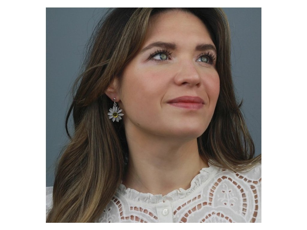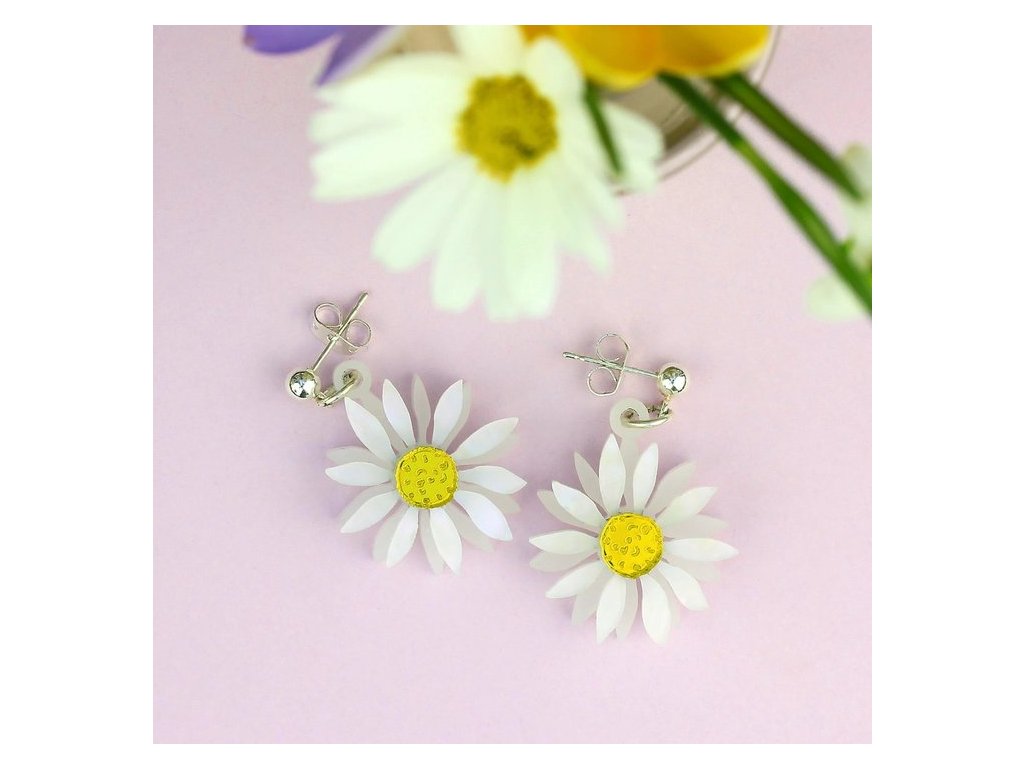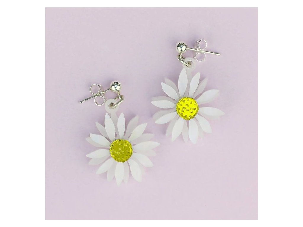 Náušnice ve tvaru sedmikrásek jsou ručně vyráběny z vrstev laserem řezaného akrylu. Bílá matná zadní vrstva okvětních lístků je pokryta krásnou, třpytivou perletí s jasným, zrcadlově žlutým středem. Tyto jednoduché náušnice jsou elegantní a lehké, co by se na nich mohlo nelíbit?
