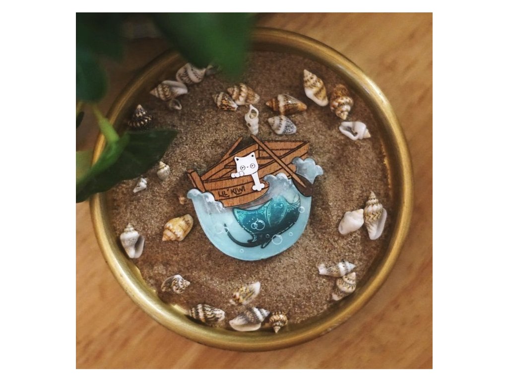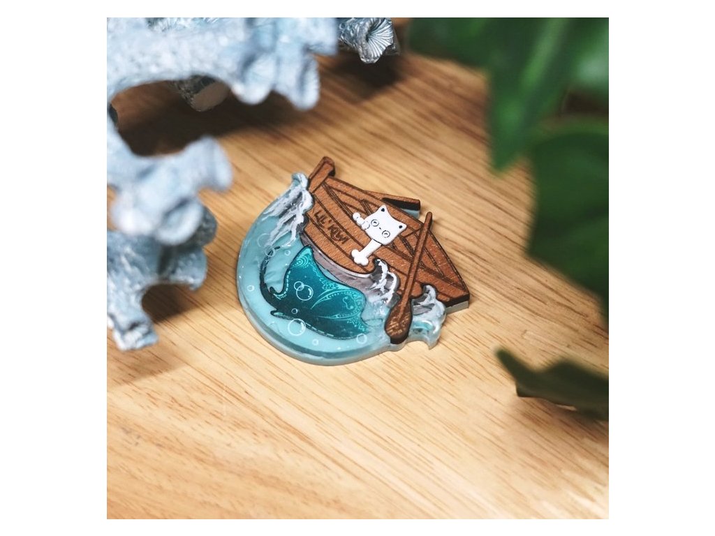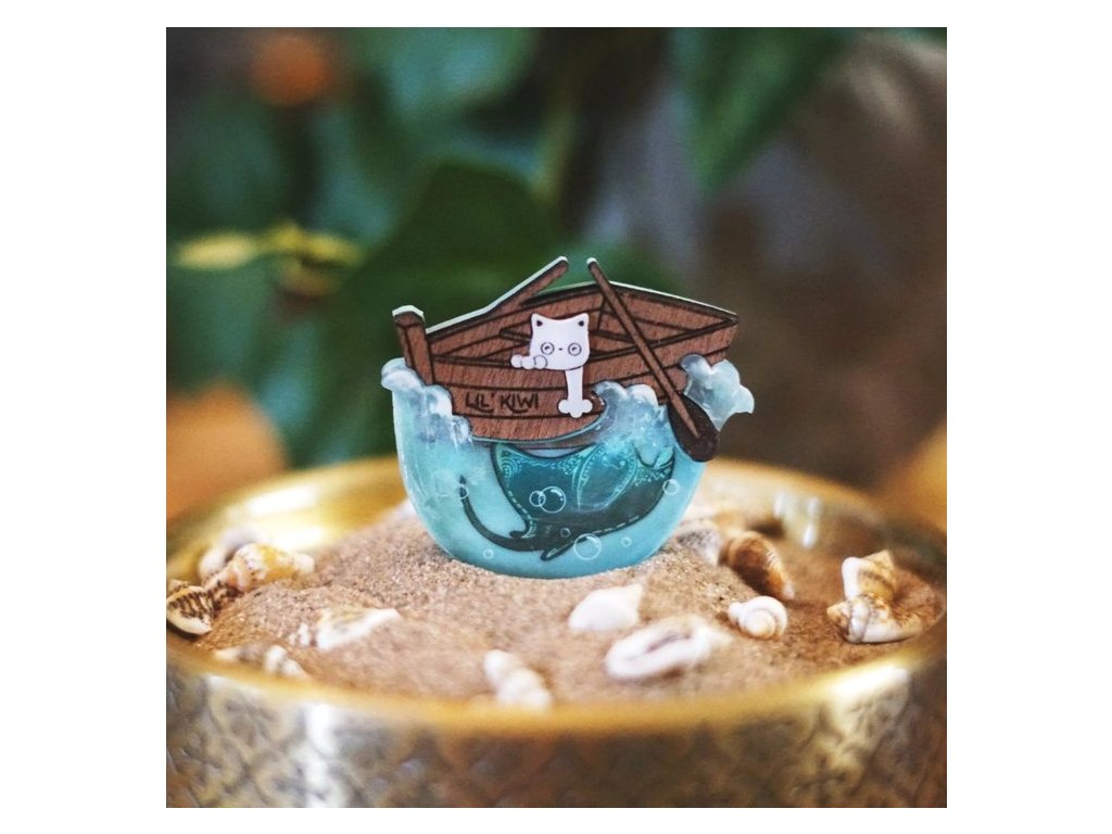 Brož o rozměrech 6 x 5 cm je vyrobena z kombinace akrylové pryskyřice - kočička a dřeva s akrylovou povrchovou úpravou - loďka. Dokonalé 3D detaily vln, které jsou ručně vyřezávané. Každý kus je skutečně jedinečným originálem. Zapínání na sponu z nerezové oceli s pojistkou.