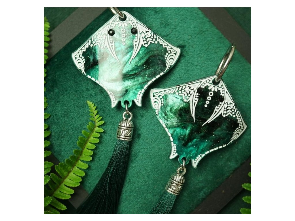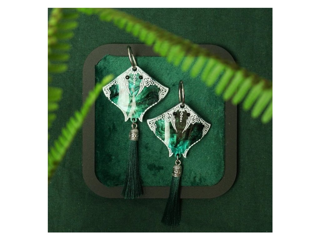 Náušnice jsou vyrobeny technikou tepelného tvarování akrylu, která dovoluje zachytit rozmáchlé pohyby rejnoka ve vodě. Jsou zdobeny pozoruhodnými detaily, laserem řezanými ornamenty a hedvábným střapcem. Jsou lehké, odolné, nadčasový doplněk pro ty, kteří ocení umělecké zpracování i tichou sílu přírodního světa. Kroužek náušnice je vyroben z chirurgické oceli.