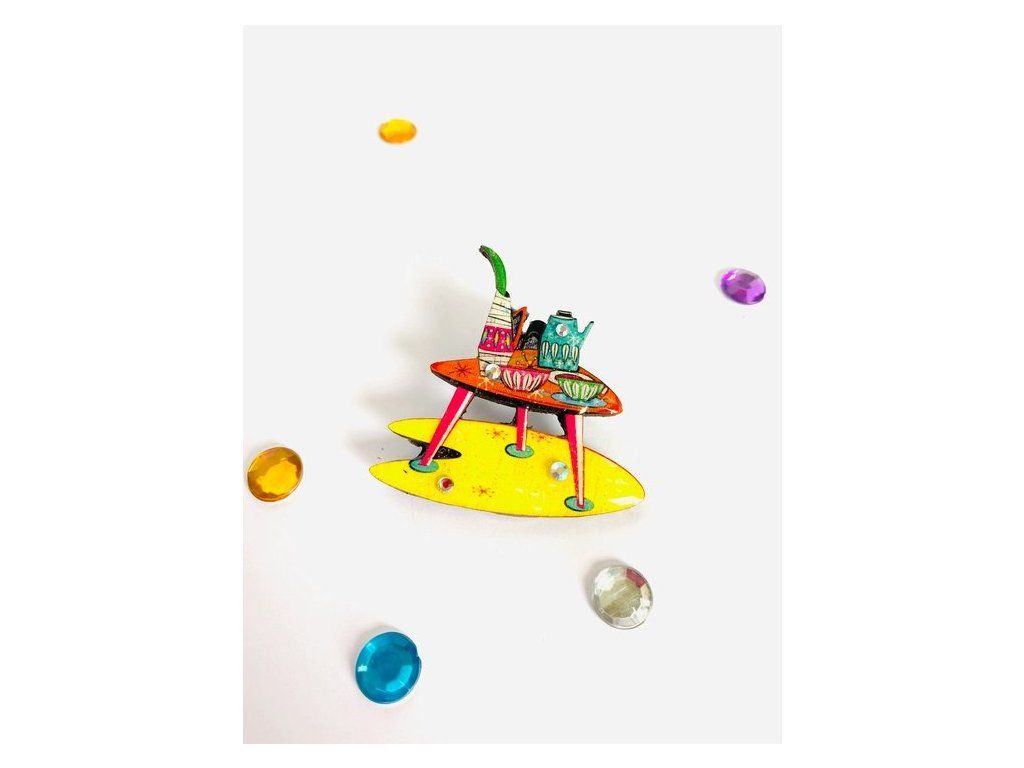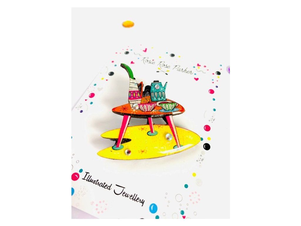 Úžasná brož ve stylu poloviny století s motivem jídelního stolku, konvičky, šálků a vázy. Rozměry 5 cm x 6 cm. Vyrobena z laserem řezaného dřeva a s povrchem z akrylové pryskyřice. Zdobena ručně třpytivými kamínky. Zapínání na brožový můstek s bezpečnostní pojistkou.