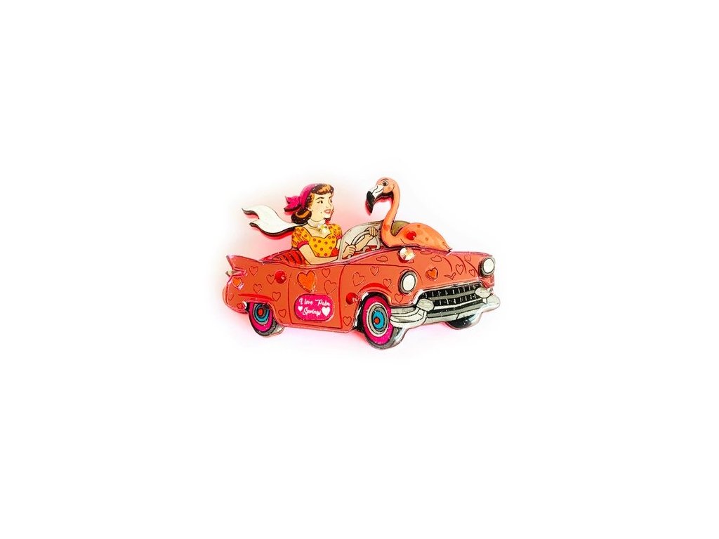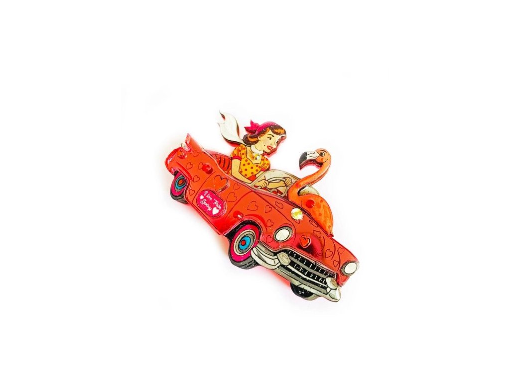 Jedná se o fantastickou brož plnou detailů, vyrobenou z tří vrstev dřeva, karoserie auta je vyrobena s růžového akrylu se zrcadlovým leckem a vyrytými srdíčky.
