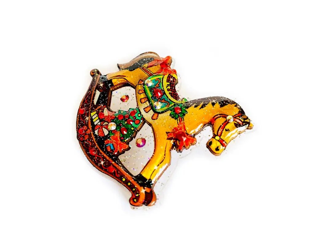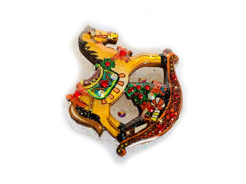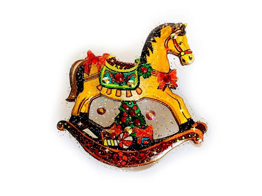 Udělejte Vánoce výjimečnými s touto roztomilou broží houpacího koníka s dárky. Koník je umístěn na třpytivé, průsvitné akrylové pryskyřici a doplněn barevnými krystalky.