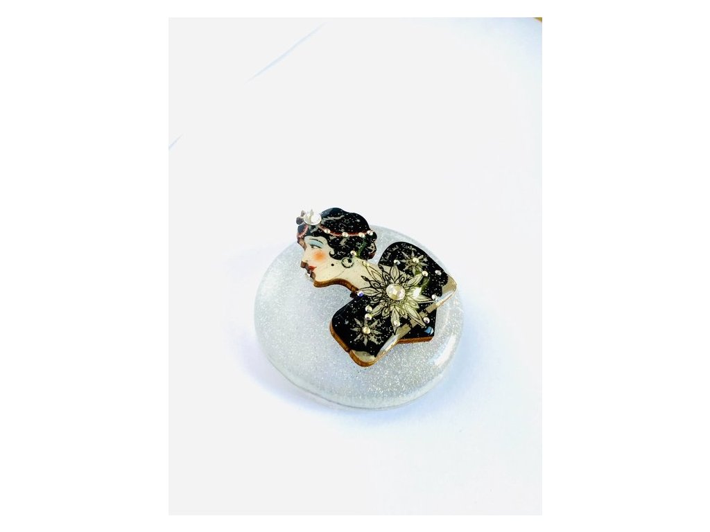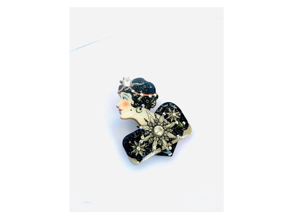 Drobnější brož v elegantní černo bílé kombinaci je inspirována stylem Art Deco a módou 20. let. Autorská ilustrace je vytištěna na certifikovaném, březovém dřevě, ručně doplněna akrylovou pryskyřicí a poté zdobena třpytivými kameny a glitry. Krásný moderní doplněk Vašeho outfitu ve stylu art deco.