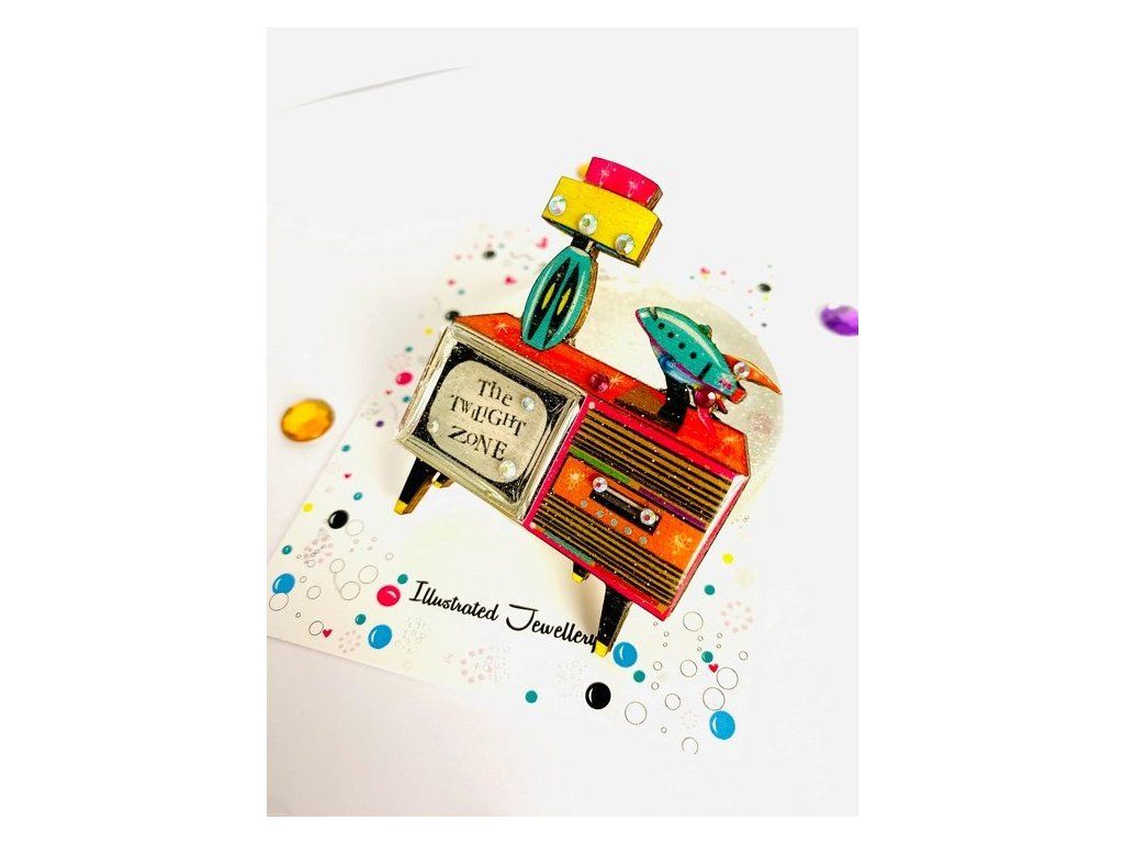 Tato úžasná brož, která je jako stvořená pro milovníky stylu poloviny století a televizní nadšence. Vytvořena podle originální ilustrace Rosie Parkerové, vyřezaná z certifikovaného dřeva a povrchově upravená vytvrzenou pryskyřicí s ručně zasazenými drahokamy. P