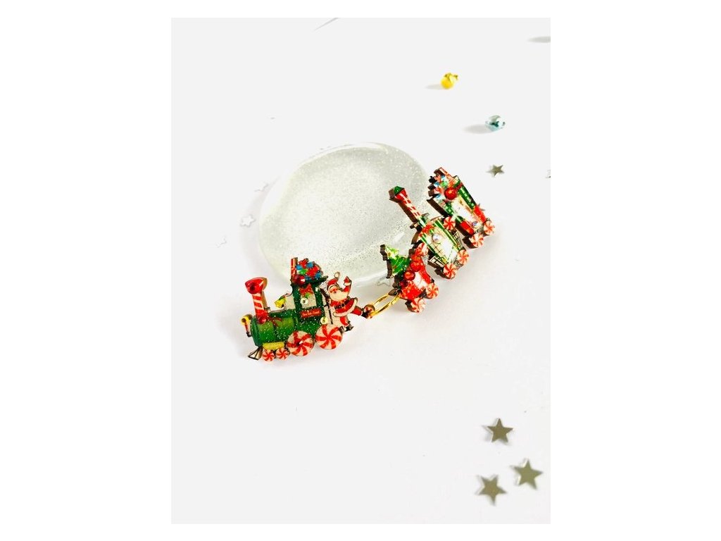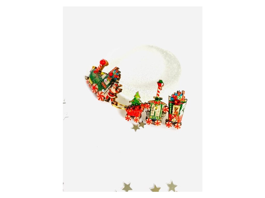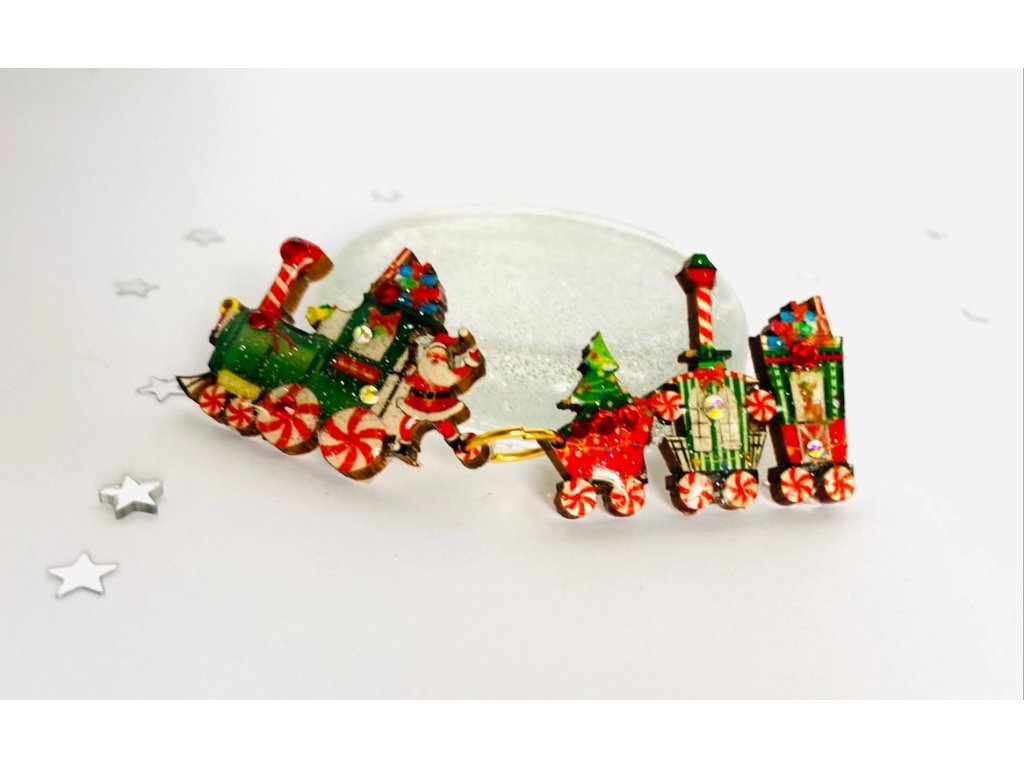 Krásná vánoční brož vláček, včetně Santy a Rudolfa! Zdobená třpytivou pryskyřicí a krystaly. Brož sestává ze dvou částí, lokomotiva je ke třem vagónkům připojena zlatým kroužkem. Každá část má vlastní zapínání z nerezové oceli.