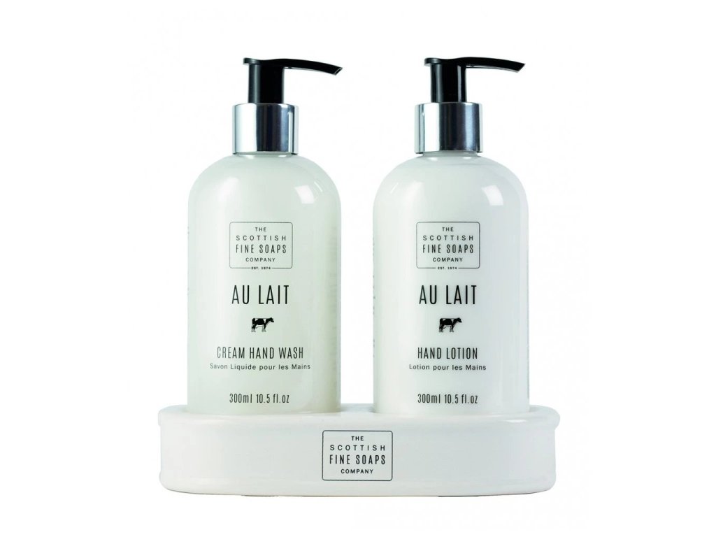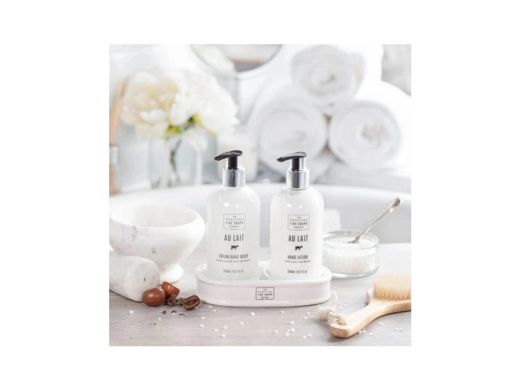 Dárkové balení tekutého mýdla a mléka na tělo a ruce AU LAIT s praktickým keramickým stojánkem.
