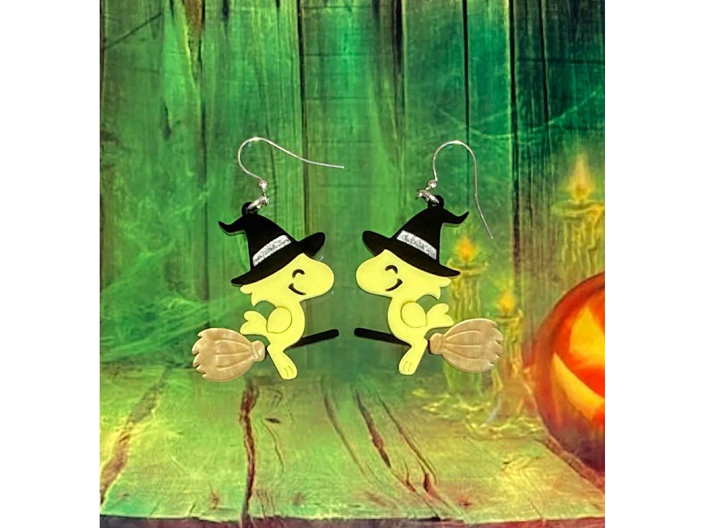 Náušnice Žlutí ptáčci s čarodějnickými klobouky na koštěti