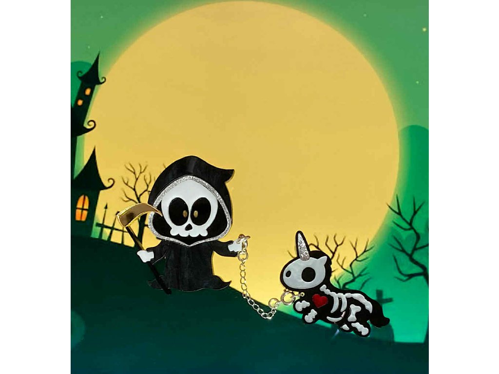 Set dvou broží Smrtka s jednorožcem na vodítku