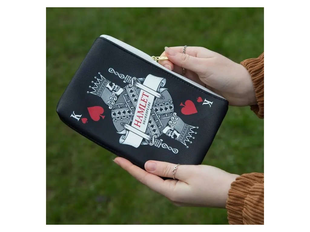 Oslavte dílo velkého dramatika s tímto praktickým pouzdrem z vegan kůže se zipem. Na první pohled zaujme jeho výrazný design v černé barvě s motivem karty srdcového krále s lebkami. Zadní strana peněženky je zdobena výrokem: „Být či nebýt, to je otázka.“ Pouzdro je vhodné na tužky, make-up, doklady a další potřebné drobnosti.