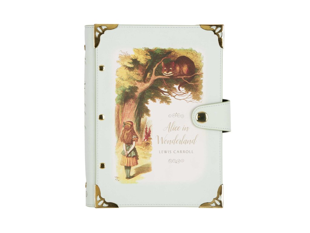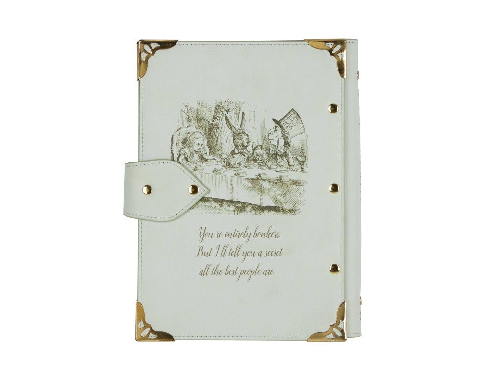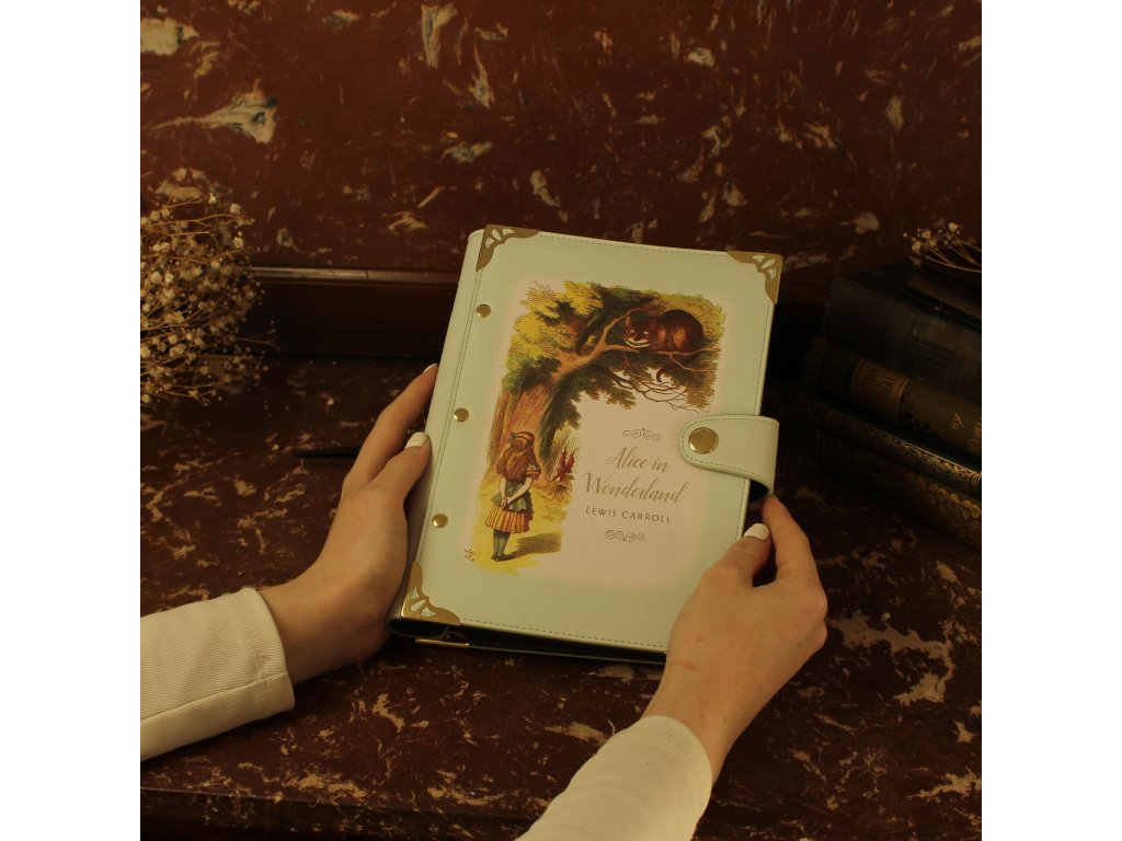 Zápisník s motivem slavné knihy Lewise Carrolla Alenka v říši divů - Alice’s Adventures in Wonderland. Tento světle tyrkysový zápisník s originální ilustrací Sira Johna Tenniela z roku 1865 zobrazuje Alenku, jak vzhlíží ke Šklíbovi. Na zadní straně zápisníku je nápis: „Jsi úplně šílená. Ale prozradím ti tajemství... všichni nejlepší lidé jsou.“, který se objevil ve filmové adaptaci románu od Tima Burtona. Oslavte talent literárního klasika Lewise Carrolla a dodejte svému životu nádech šílenství se zápisníkem z vegan kůže, zdobeným zlatými rohy a vyměnitelnými papíry.