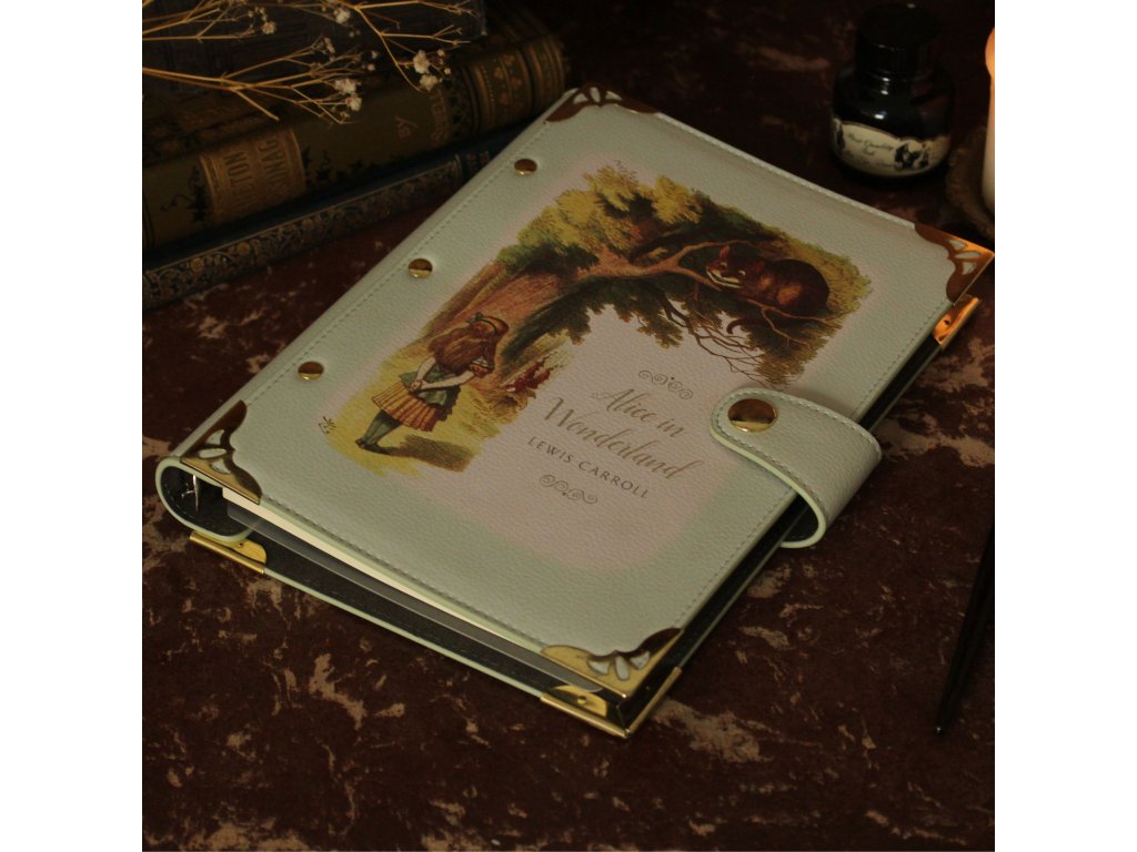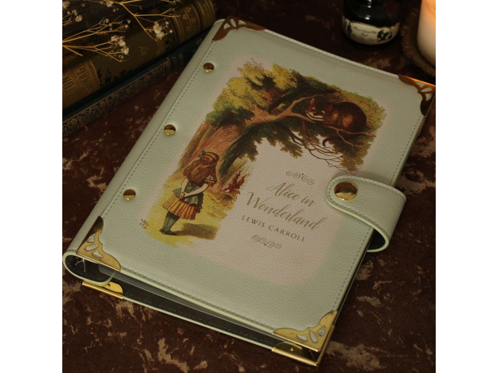 Praktický kroužkový zápisník s vyměnitelnými listy papíru s motivem románu Alenka v říši divů, světle tyrkysový