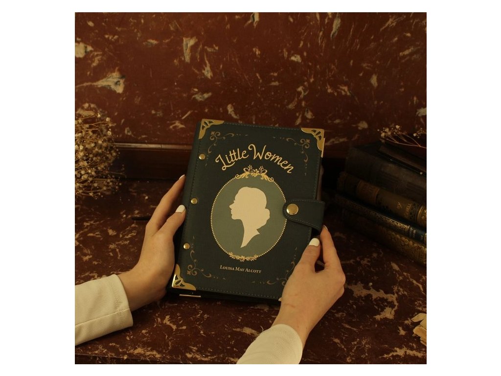 Odvaha, růst a sebevědomí jsou hlavními tématy románu Malé ženy. Pokud jsou toto i Vaše životní kréda, tento zápisník je právě pro Vás. Oslavte klasickou literaturu s tmavě zeleným zápisníkem z vegan kůže, zdobený zlatými rohy a vyměnitelnými papíry.